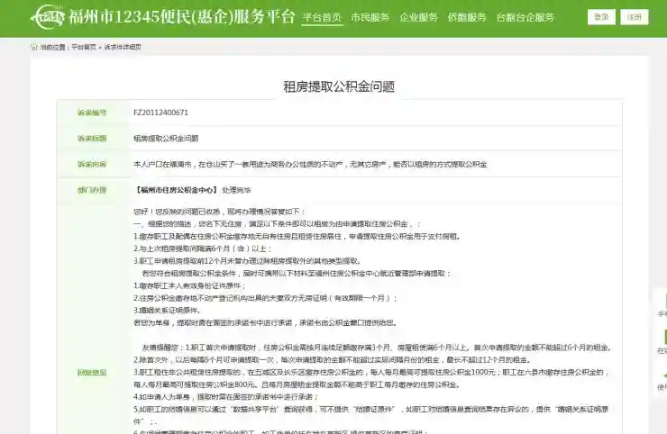 近日,有市民在福州市12345便民(惠企)服务平台咨询关于"能否以租房的方式提取公积金"的问题,一起来看看吧!